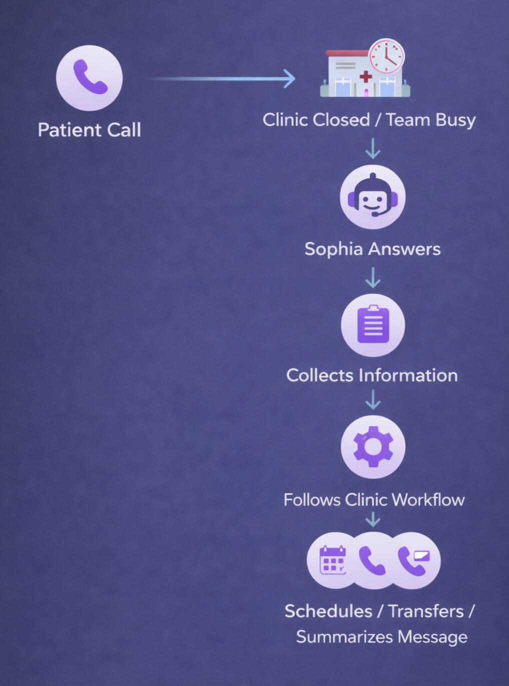 Sophia assists with call handling, intake, and message routing. It does not provide medical advice or replace professional medical judgment.