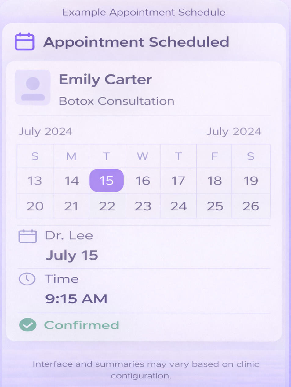 Select from premium AI voices and tailor the greeting, phrasing, and call flow to match your medical spa’s brand and client experience.