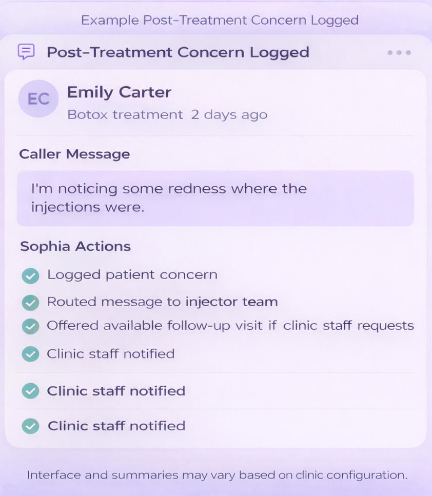 Sophia documents post-treatment questions and follows your clinic’s escalation workflow to route callers to the appropriate staff member.✓ Clinic-defined call workflows✓ Document and route post-treatment concerns✓ Emergency fallback instructions when callers describe serious symptoms✓ Custom protocols configured for your practice