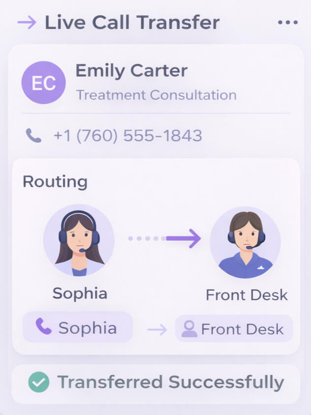Sophia can transfer calls to the appropriate team member whenever needed. If a caller prefers to speak with staff directly, the call can be routed to your front desk or on-call team.