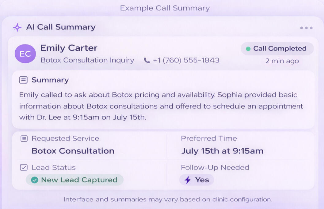 Sophia connects to your clinic’s phone system to answer calls when your team is busy or the office is closed. She collects caller information and follows your clinic’s workflow to schedule or route calls.✓ Answer missed or after-hours calls automatically✓ Collect caller information and appointment requests✓ Follow your clinic’s scheduling and call-routing workflow✓ Provide secure AI call summaries for your team
