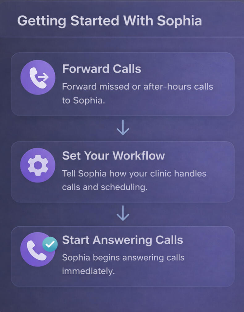 3. Start Answering CallsSophia begins answering calls immediately — scheduling appointments or routing callers when needed.Most clinics are live in under 10 minutes. No technical setup required.
